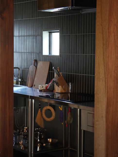 かつて椿の色として親しまれてきたこの伝統色を宿名に据えることで、伊豆大島の象徴でもある椿が持つ歴史や文化を大切にしたいという思いを込めた。同時に、蘇芳色を宿のテーマカラーと位置づけ、リネンやソファなどのファブリックを中心に空間全体を統一している。